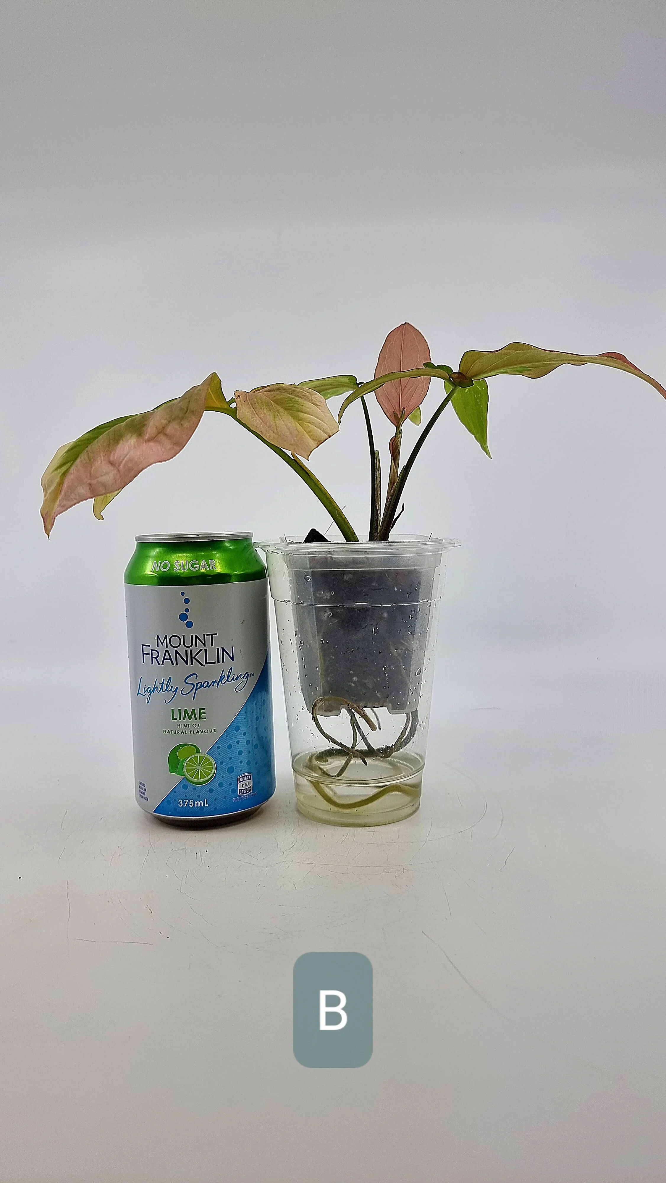 A beautiful syngonium featuring three colour pattern - green, light cream and pink. This stunning syngonium is a vining plant which originates from the tropical forest of South America. (Non TC)